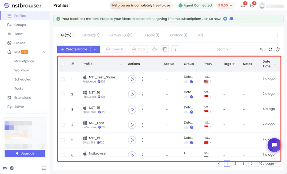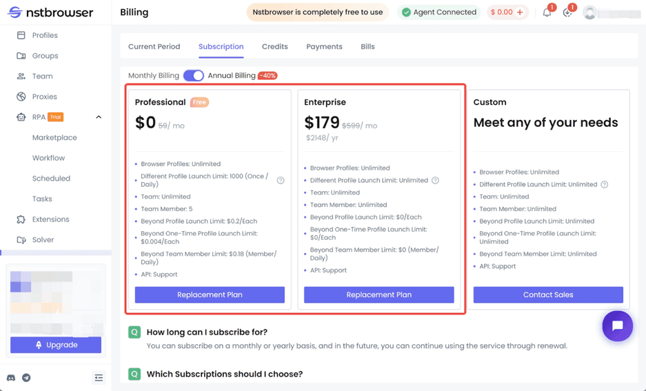 ● Free Subscription: the free Pro version offers 1,000 profile launches per day with an unlimited number of browser profiles and teams, but only allows 5 team members.